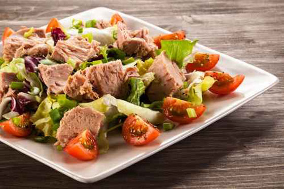 العشاء: طبق سلطة خضراء، مضاف اليه تونة مصفاة و شرائح بصل وليمون وفلفل اخضر.