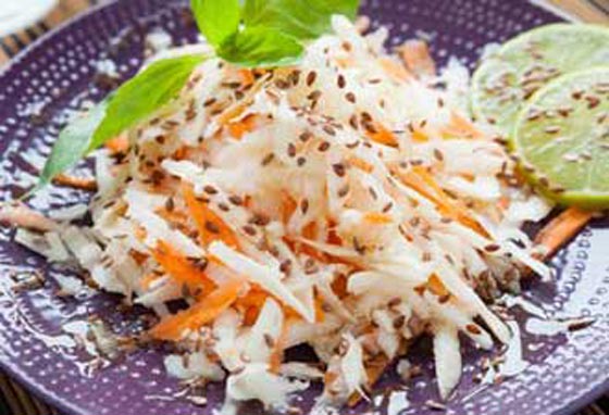 - وجبة الغداء: تناولي ما ترغبين فيه لكن قبلها قومي بإعداد سلطة خضراء و أضيفي إليها ملعقة من مسحوق بذور الكتان مع الصلصة و تتبيلة زيت الكتان مع خل التفاح و هذه السلطة ستجعل تشعرين بالشبع و تتناولين القليل من الطعام كما أنها ستجعل عملية الهضم أكثر بطئا و تجعل عملية تمثيل الغذاء أكثر سرعة و تقوم بحرق الدهون في الجسم.