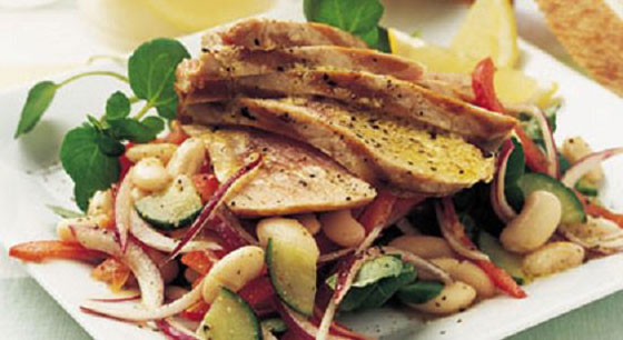 تتكون هذه السلطة من شرائح التونة المضاف لها الزيت الزيتون وعصير الليمون، ويضاف لهم حبات الفاصوليا البيضاء المطهية على البخار، مع شرائح البصل والفلفل الألوان، وتعتبر هذه الوجبة من الوجبات المغذية التى تتمتع بمذاق شهى وسعرات حرارية قليلة.