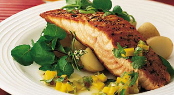 يعتبر السالمون هو المكون الرئيسى لهذه الوجبة، حيث تضاف شرائح السالمون المشوية، إلى قطع المانجو الصغيرة وشرائح البصل وزيت الزيتون، وتقدم الوجبة مع شرائح البطاطس المسلوقة ، وتناسب هذه الوجبة الأشخاص الذين يميلون إلى تناول الأكلات الغريبة وذلك بفضل وجود صلصة المانجو ذات المذاق المميز.