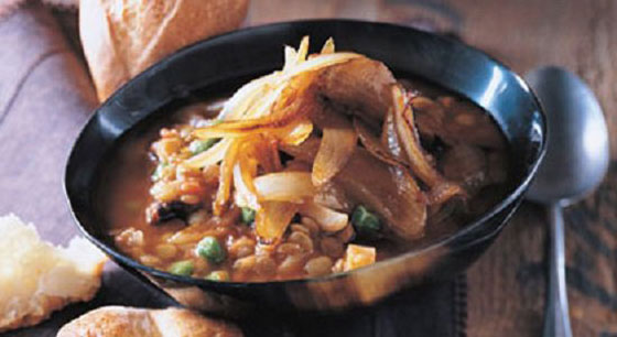 يتم سلق العدس مع قطع المشروم الطازجة مع ثمرات البندورة/ الطماطم والجزر، ويترك مدة 35 دقيقة، حتى ينضج جيداً، ثم يضاف قطع شرائح البصل الأحمر وتخلط جيداً بالعدس مدة 5 دقائق.