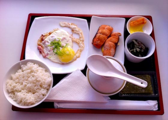 6- وجبة الإفطار: تعتبر وجبة الإفطار الوجبة الأساسية عند الشعب اليابانى وتشمل مجموعة أطباق أبرزها الأسماك والأرز والبيض (العجّة) والأعشاب البحرية وطبق الخضار مع فول الصويا مع الخضروات وحساء ميسو والشاي.