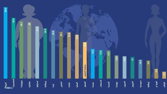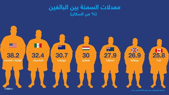 ومعدلات السمنة بين البالغين في الولايات المتحدة والمكسيك ونيوزيلندا وهنغاريا هي الأعلى في العالم، في حين أنها الأقل في كل من كوريا الجنوبية واليابان. وبحسب الخبراء، من المتوقع أن ترتفع معدلات السمنة أكثر في العام 2030، وستكون هذه الزيادة أسرع من غيرها في كل من كوريا وسويسرا.
