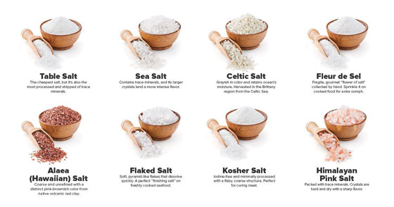 عادة ما يعتمد الطهاة في البرامج التليفزيونية على أنواع مختلفة من ملح الطعام، والتي تصيب المستخدم العادي بالحيرة والتشكك فيما يستعمله في منزله، غير أن ملح الطعام هو ملح الطعام، ولا توفر الأنواع باهظة التكلفة من ملح الطعام فائدة صحية أكثر من الأنواع الأقل تكلفة.