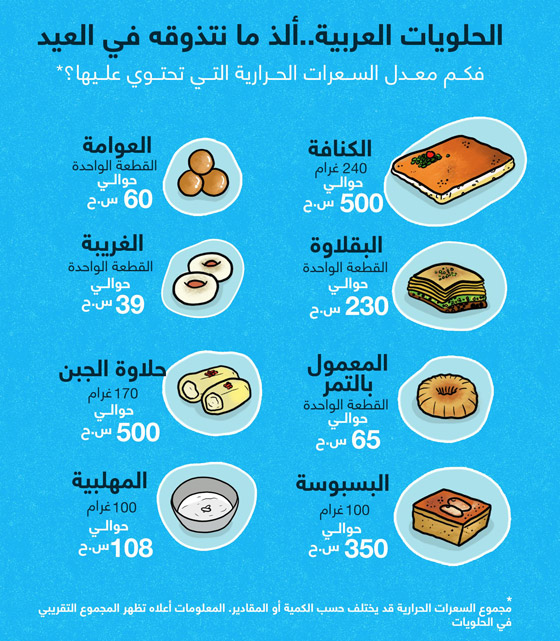 اليكم مجموعة من أبرز وأشهر الحلويات التي تقدم لدى الشعوب العربية خلال العيد، مع عدد السعرات الحرارية في كل منها. ونصيحتنا لكم اليوم، لا تكثروا من تناول أنواع الحلويات والسكر، لكن تناولوا القليل منها لتحافظوا على الوزن وصحة القلب.