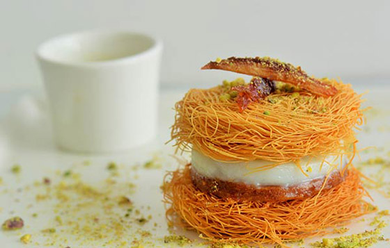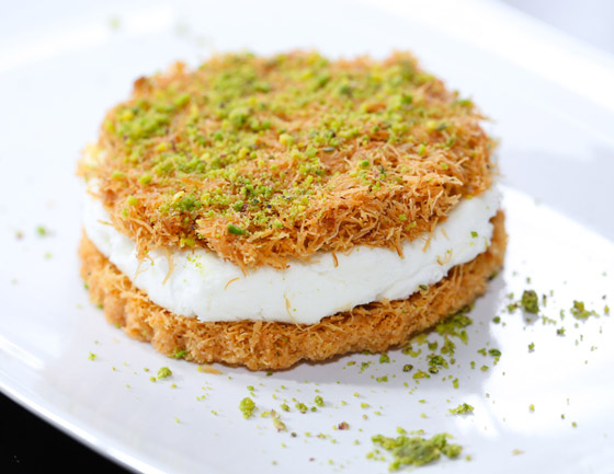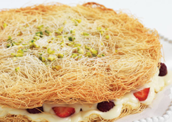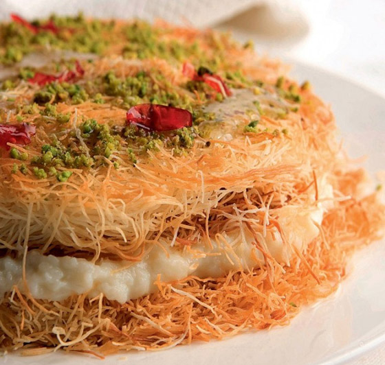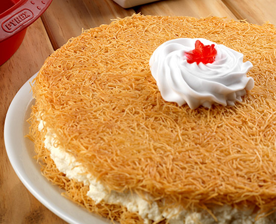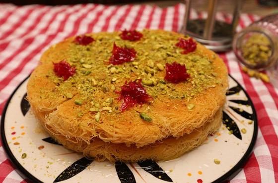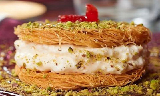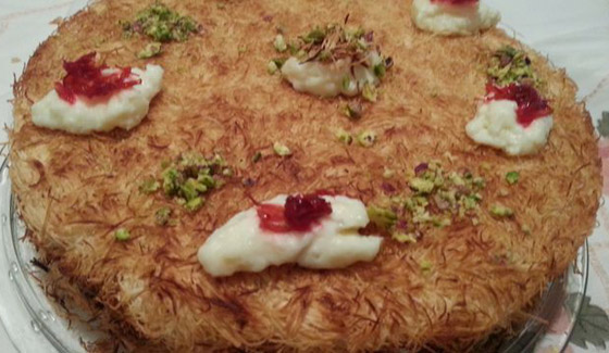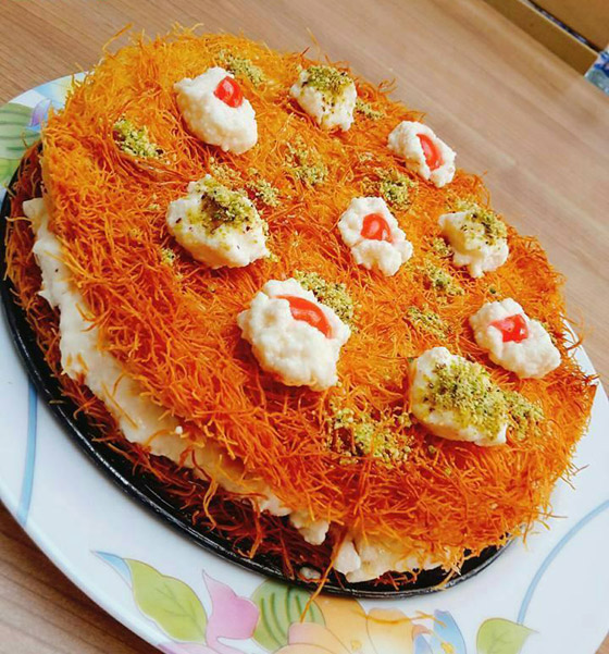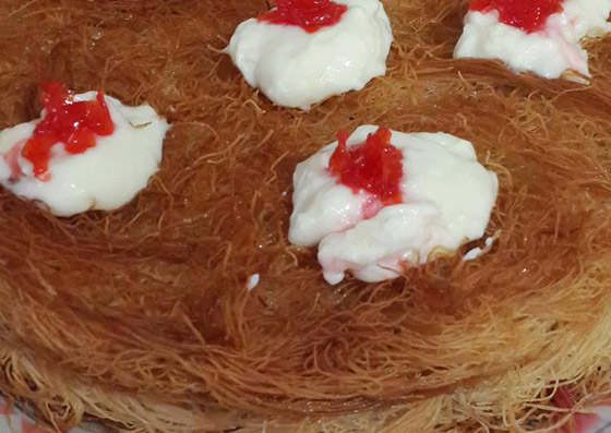 4. طريقة التقديم: توزَّع طبقة من الشعيريَّة في طبق التقديم؛ يمدّ كوبان ونصف الكوب من القشدة عليها، مع التمسيد. تُغطَّى القشدة بالطبقة الثانية من الشعيريَّة. يُصبّ القطر على السطح، الذي يُزيَّن بالباقي من القشدة، والفستق، ومربّى زهر الليمون.