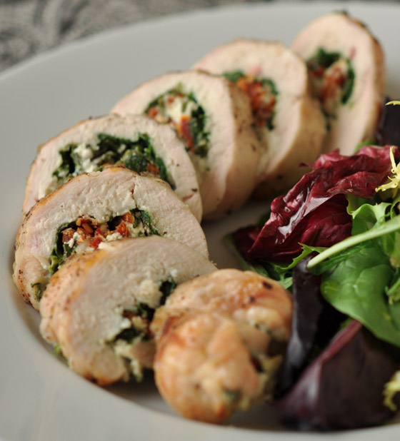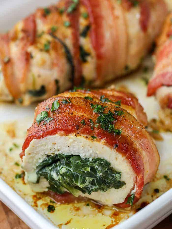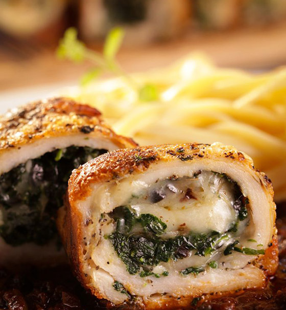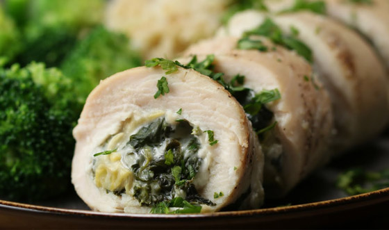 4. تبلوا الدجاج ببهارات الدجاج ثم وزعوا السبانخ والجبن ولفوا الدجاج على شكل رول وأغلقوه بعود خشبي.