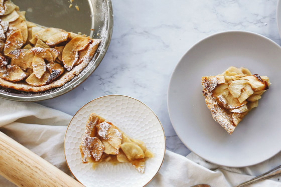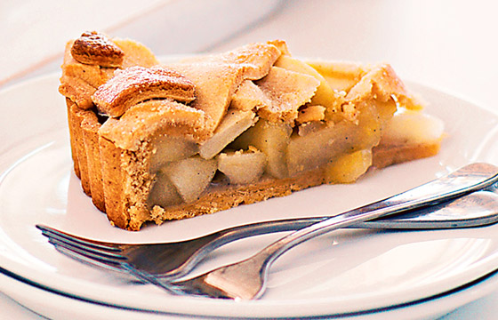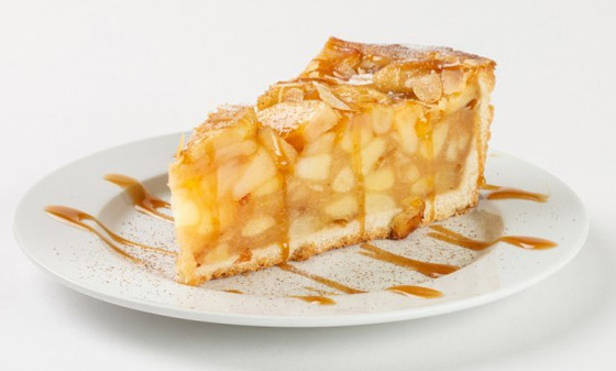 5. ضعوا العجينة في قالب تارت وافردوها بطريقة مناسبة لتغطي القالب كاملاً، ثم وزعوا حشوة التفاح فوق العجينة بالتساوي.