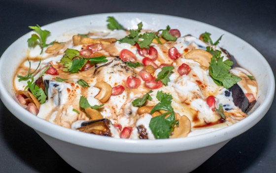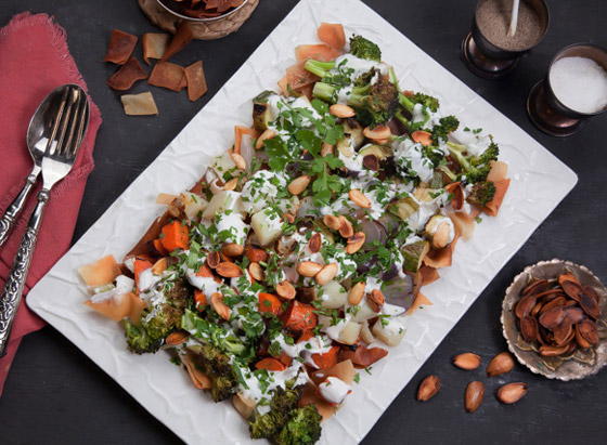 2. رصوا الخبز المحمص في قاع طبق التقديم، وأضيفوا الخضار المشوية فوقه، ثم اسكبوا صوص الزبادي.