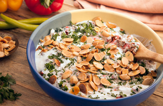 1. في وعاء ضعوا الزبادي مع الطحينة، وأضيفوا عصير الليمون، والثوم المفروم، وقلبوا جيداً حتى تتداخل المكونات مع بعضها البعض.
