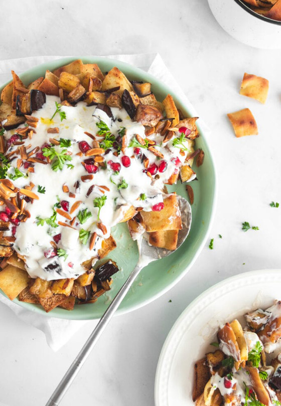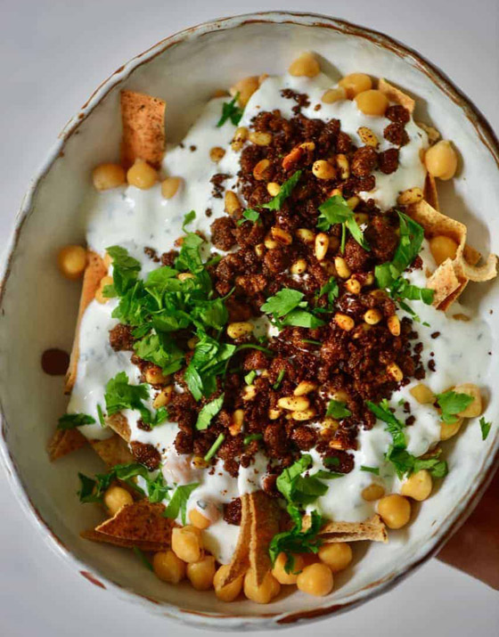 3. زيّنوا الطبق بالمكسرات والبقدونس، ثم قدموا الفتة فوراً.