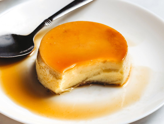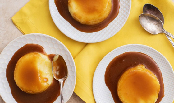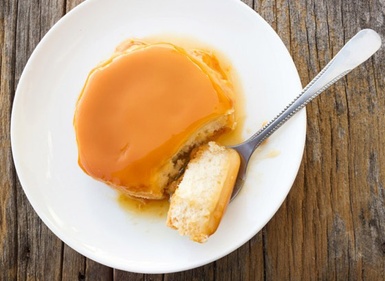 7. أخرجوا الصينية من الفرن وأضيفوا الكريم كراميل على الوجه، ثم ضعوا الحلى في الثلاجة حتى يجمد، ثم قدموه.