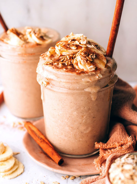 2. ضعوا قطع الموز، وحليب اللوز، والعسل، والفانيليا، والقرفة، والزنجبيل، وجوزة الطيب، والملح في الخلاط الكهربائي مع الشوفان واخلطوا جميع المكونات مع بعضها البعض حتى تتجانس.