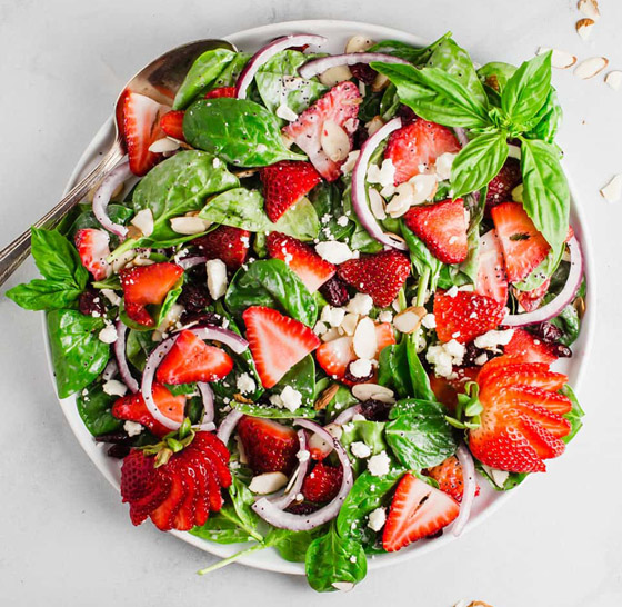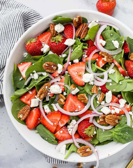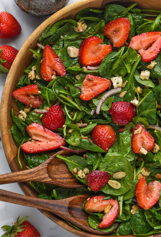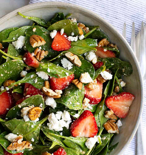 2. افردوا السبانخ في طبق التقديم، ثم وزعوا الفراولة المقطعة، ثم جبن الفيتا والمكسرات المجروشة.