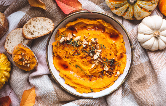 3. اخفقوا القرع والثوم وإكليل الجبل في الخلاط الكهربائي، ثم أضيفوا الحمص المسلوق، والطحينة، وعصير الليمون، والفلفل الأسود، والملح، واستمروا في الخلط حتى تحصلوا على قوام كريمي.