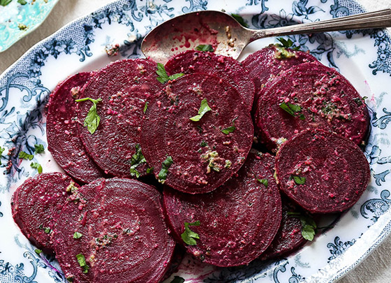 2. قشروا الشمندر ثم قطعوه إلى مكعبات متوسطة الحجم، أو شرائح، وضعوها في طبق التقديم.