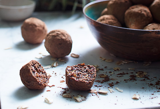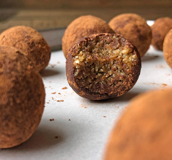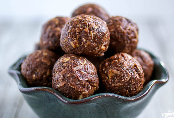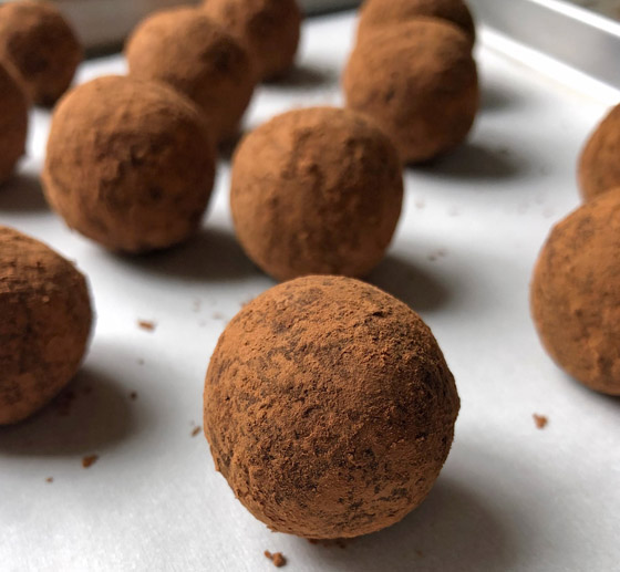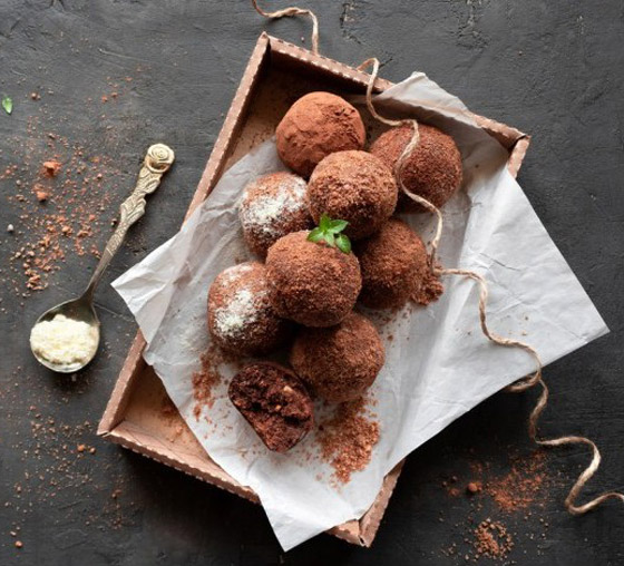 4. اصنعوا كرات متساوية ومتوسطة الحجم من الخليط، ثم غمسوها في الكاكاو، وضعوها في الثلاجة حتى تتماسك، ثم قدموها باردة.
