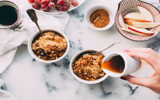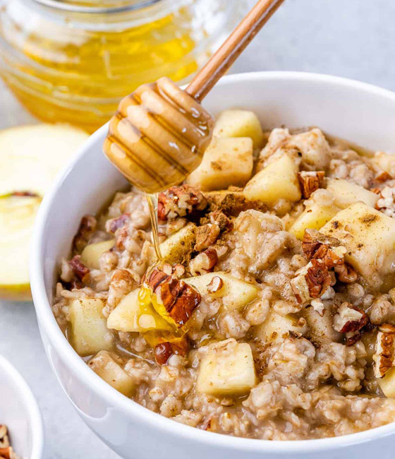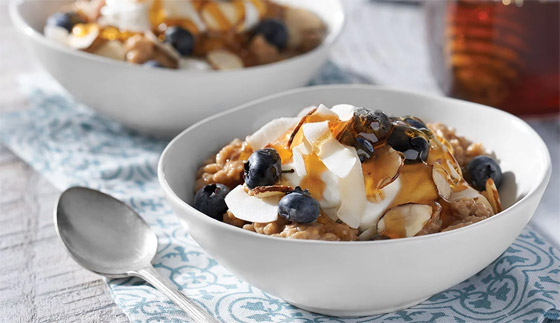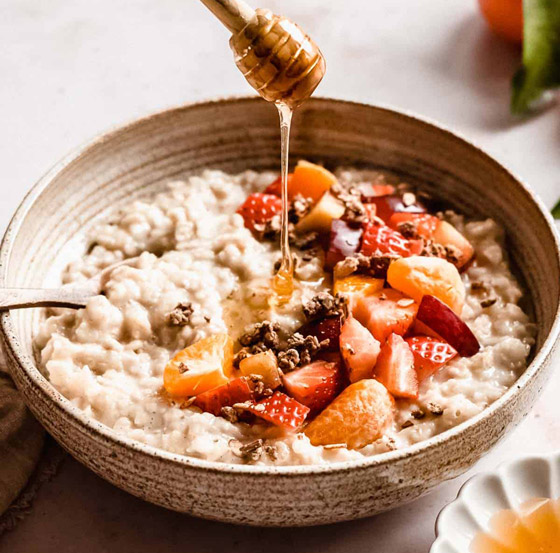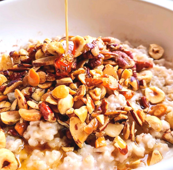 4. أخرجوا البرطمان من الثلاجة، وأضيفوا العسل والمكسرات والفواكه المجففة على الوجه ويُقدم فوراً.