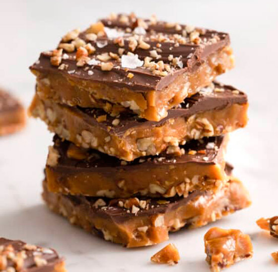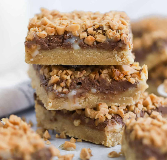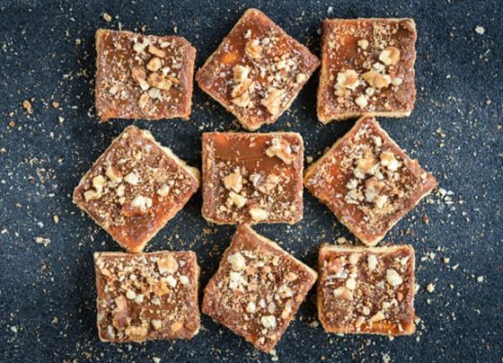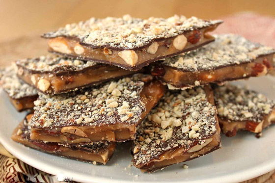 4. أدخلوا الصينية للفرن مرة أخرى حتى تذوب الشوكولاتة، ثم أخرجوها من الفرن ووزعي المكسرات بالتساوي في الصينية، وقطعوها وقدموها.