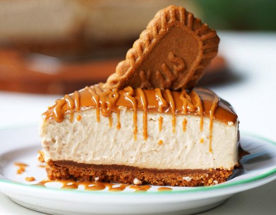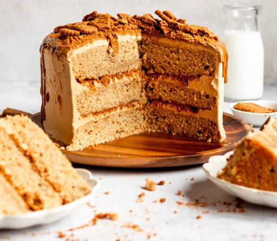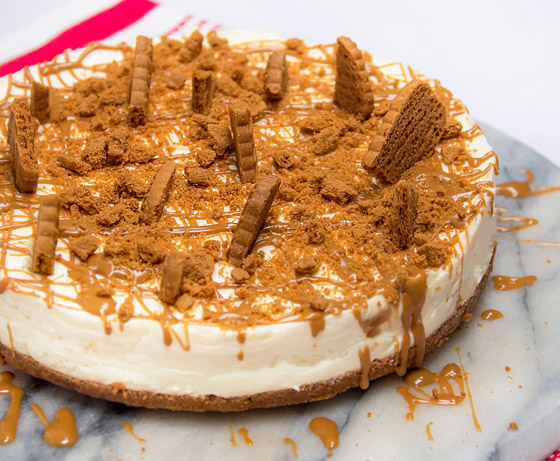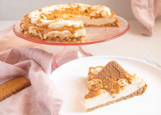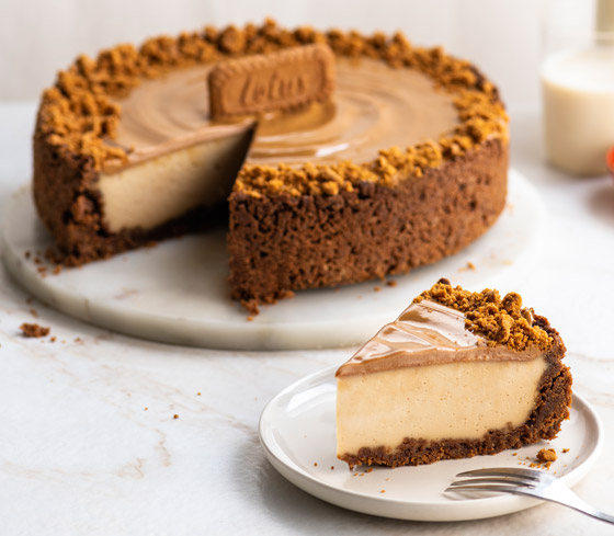 5. أخرجوا القالب من الفرن، ووزعوا زبدة اللوتس على الوجه، وأدخلوا القالب للثلاجة حتى يبرد ثم يُقطع الحلى ويُقدم بارداً.