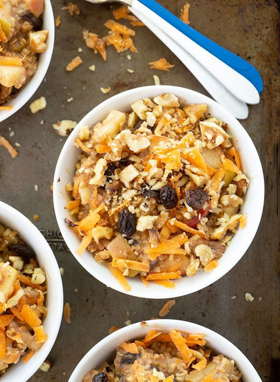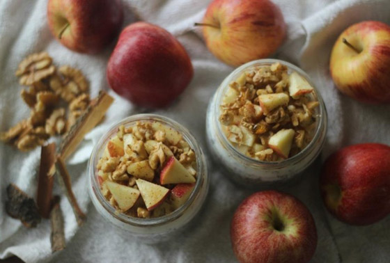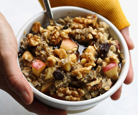 4. ضعوا الشوفان بالتفاح في طبق التقديم، ووزعوا الجوز على الوجه وقدموه.
