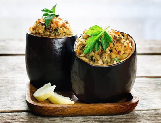 2. احشوا حبات الباذنجان بخليط البرغل لتملئوا ثلثيها، ثم رصّوها في قدر.