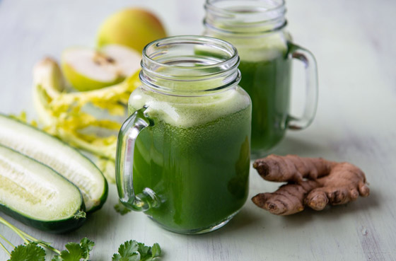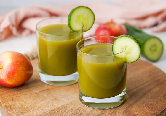 2. الخيار والزنجبيل: يعد عصير الخيار والزنجبيل مزيجًا مرطبًا وحارقًا للدهون يعمل بشكل رائع على حرق دهون البطن. يحتوي الخيار على سعرات حرارية منخفضة للغاية ومحتوى عالٍ من الماء، مما يجعله مكونًا مثاليًا لفقدان الوزن. كما يحتوي على مضادات الأكسدة وخصائص مضادة للالتهابات تقلل من الانتفاخ. في حين أن الزنجبيل، المعروف بتأثيره الحراري، يزيد من درجة حرارة الجسم ويعزز عملية التمثيل الغذائي. يمكن أن يكون هذا العصير إضافة قوية للروتين الصباحي لبدء حرق الدهون.