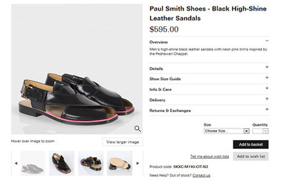 أثارت الصنادل الفاخرة التي صممها البريطاني بول سميث من وحي تصاميم باكستانية، ضجة في باكستان نظراً إلى سعرها الباهظ (500 دولار) الذي يزيد 100 مرة عن السعر الأساسي لهذه الصنادل و"لطرازها القديم". وأثارت هذه الصنادل ضجة على "تويتر" حيث هزأ المستخدمون بالنموذج الذي يعرضه المصمّم من هذه الصنادل المعروفة محلياً بـ "شابال" التي يكون نعلها المقوس من الجلد أو المطاط ويظهر فيها كعب الرجل وطرف أصابعه.