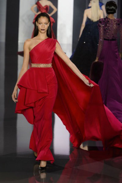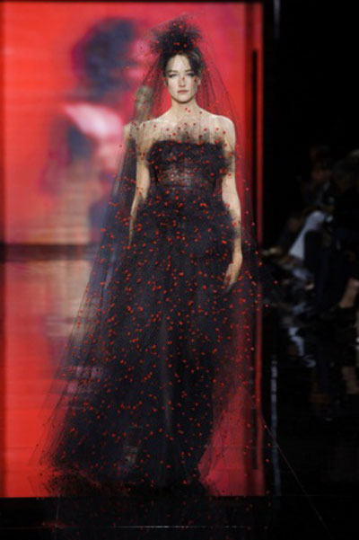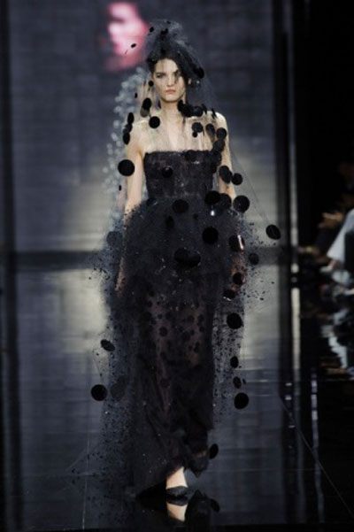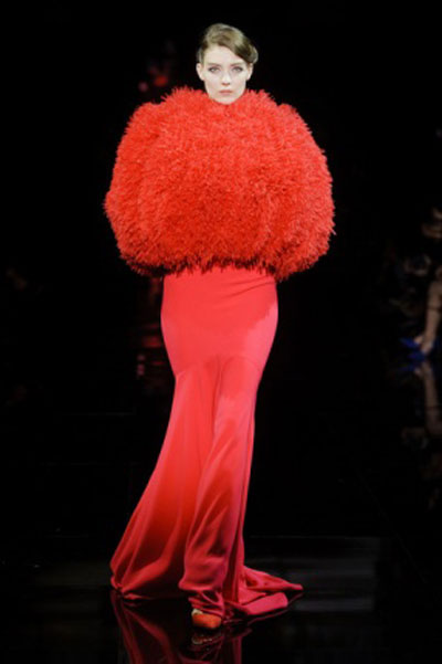 أبدع Armani كعادته في هذه المجموعة، حتى بات الاختيار من بينها شديد الصعوبة، لذا اخترنا ثلاث قطع مميزة تعبر عن روح المجموعة ككل، أحدها أسود والآخر أحمر، والثالث يجمع بين اللونين الرئيسيين، وقد غطى Armani أغلب تصميماته بغلالة رقيقة من التول، تبدأ من رأس العارضة حتى أخمص قدميها، بينما منح الفستان الأحمر فخامة مميزة ومختلفة، حيث جعل الجزء المنفوش هو العلوي وليس السفلي كالمعتاد.