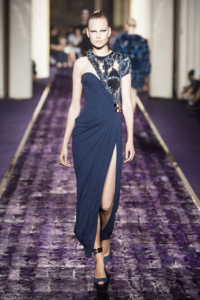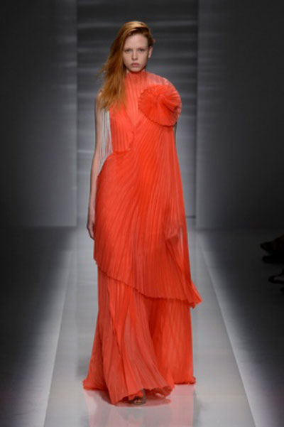 كعادتها أجادت Donatella اللعب بالأقمشة كما تريد، فتثنيها وتلفها حول أجساد العارضات كأنها طفلة تصنع الفساتين لعرائسها الصغيرة، فجاءت النتيجة رائعة –أيضاً كالمعتاد- لنختار منها بصعوبة، فستانين يتميز كل منهما بكتف واحد، وتعرجات كثيرة.