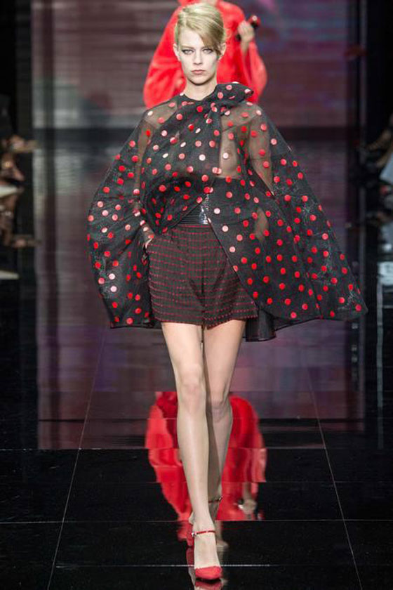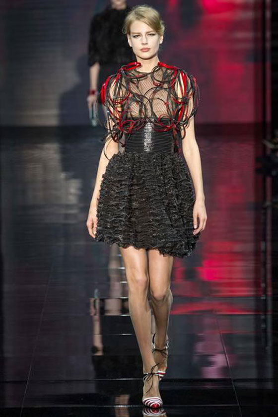 وتميزت المجموعة بقماش التول المزين بالدوائر الكبيرة. كما سيطر على المجموعة اللونان الأحمر والأسود مع تدخل خجول للون الأبيض. إليكم صور المجموعة :