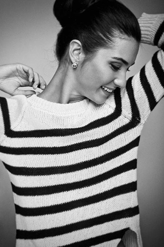 هنا أختارت توبا إطلالة شبابية مميزة بالبلوفر المخطط في إحدى جلسات التصوير