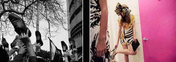 عارضة البس حذائها قبل العرض في نيويورك عام 2009، ومظاهرة بالأحذية في مصر عام 2011.