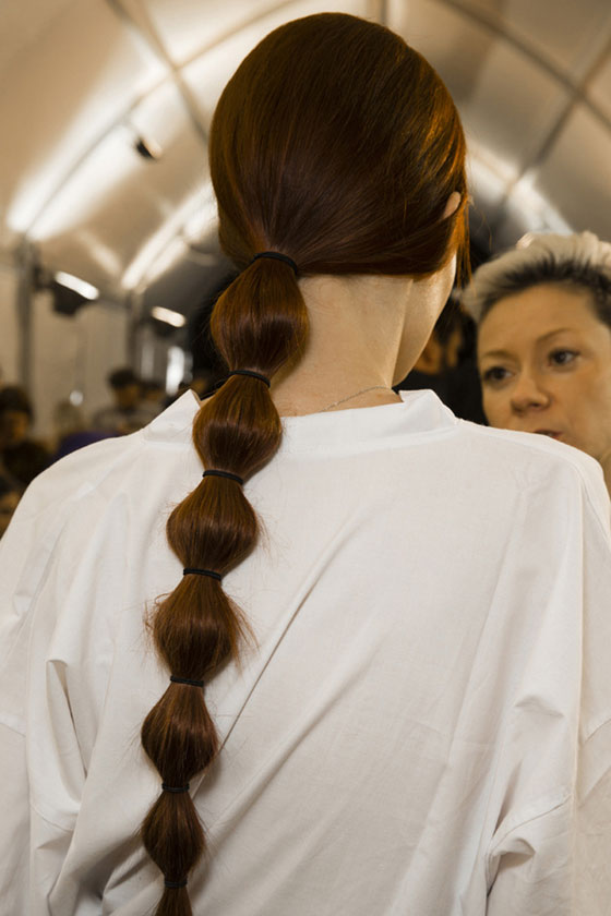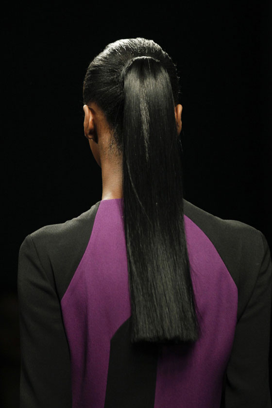 - تسريحة ذيل الحصان تمّ تنفيذها بإتقان على شعر أسود طويل في عرض Bottega Venetta.