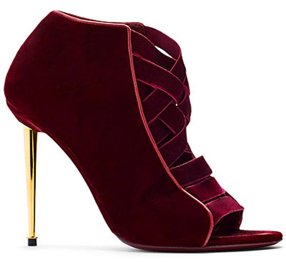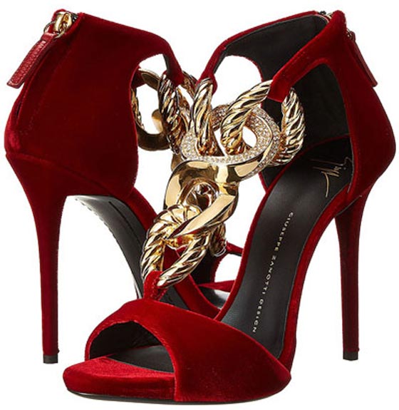 حذاء مخملي فخم بالأحمر الداكن والسلاسل الذهبية من توقيع جوسيبي زانوتي Giuseppe Zanotti.