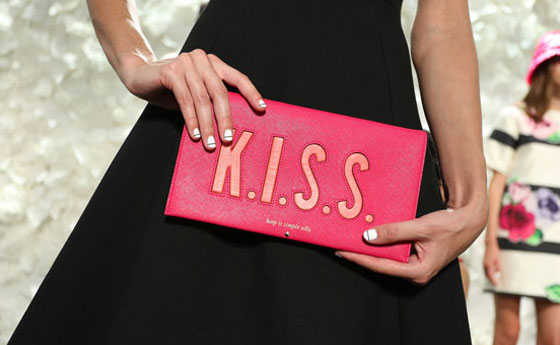 في الصورة نرى شنطة كلتش ورديه جذابة من توقيع كيت سبيد Kate Spade مدون عليها حروف كلمة KISS.