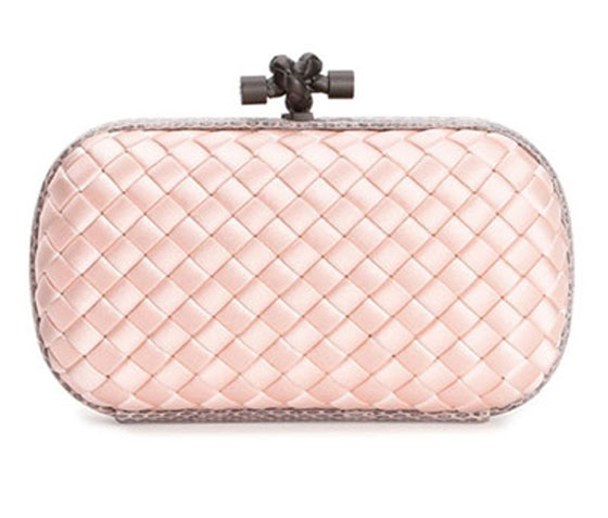 شنطة كلتش رقيقة بالوردي الفاتح من توقيع بوتيغا فينيتا Bottega Veneta .