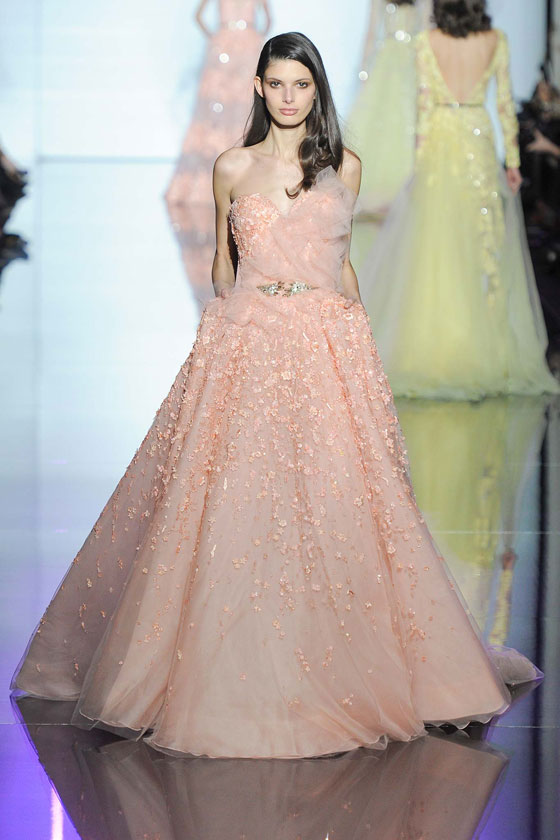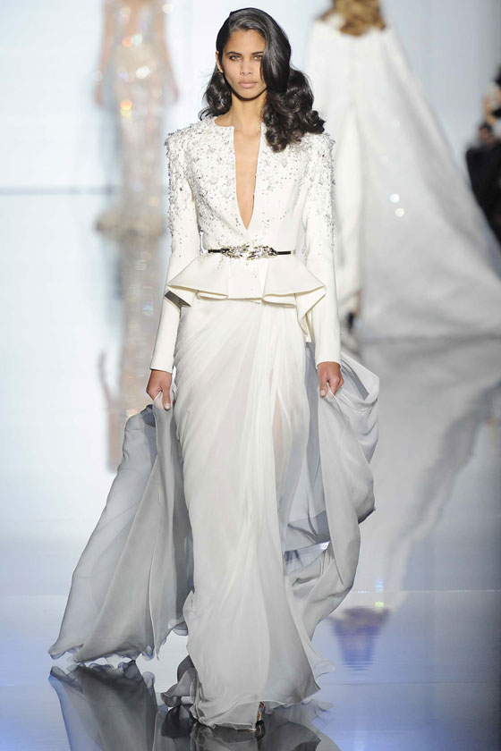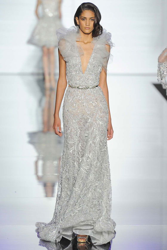 أزياء انسيابية بعذوبة وشفافية الماء، هذا أول ما يتبادر إلى الأذهان عند الاطلاع على مجموعة تصاميم الخياطة الراقية لربيع وصيف 2015 التي قدمها المصمم اللبناني زهير مراد، ضمن فعاليات أسبوع باريس للموضة. بدأ العرض بمجموعة من الأثواب البيضاء المطرزة بكثافة، ثم تلتها إطلالات باللون الأزرق المائي زينتها كشاكش على شكل أمواج تم تطريزها بأحجار الكريستال البراقة.