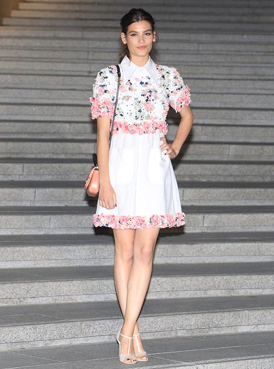 ألما جودوروسكي اختارت ثوباً مطرزاً بالأزهار من مجموعة الأزياء الجاهزة لربيع وصيف 2015 نسّقته مع صندل باللون البيج.