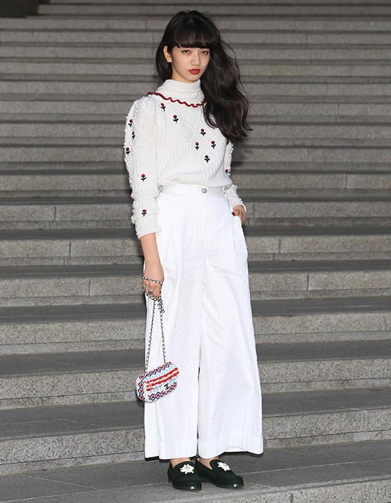 نانا كوماتسو اختارت بنطلون أبيض من مجموعة الأزياء الجاهزة لربيع وصيف 2015 وكنزة باللون نفسه من مجموعة Paris-Salzburg 2014-2015. وقد اختارت أكسسواراتها من Chanel أيضاً.