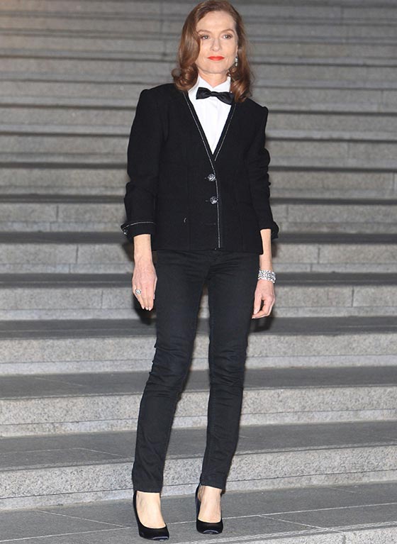إيزابيل هوبير اختارت جاكيت من الصوف باللون الأسود مع قميص من الحرير باللون العاجي وربطة عنق سوداء من مجموعة الأزياء الجاهزة لخريف وشتاء 2015-2026، وتزيّنت بأقراط للأذنين، سوار وخاتم من مجموعة Jazz.