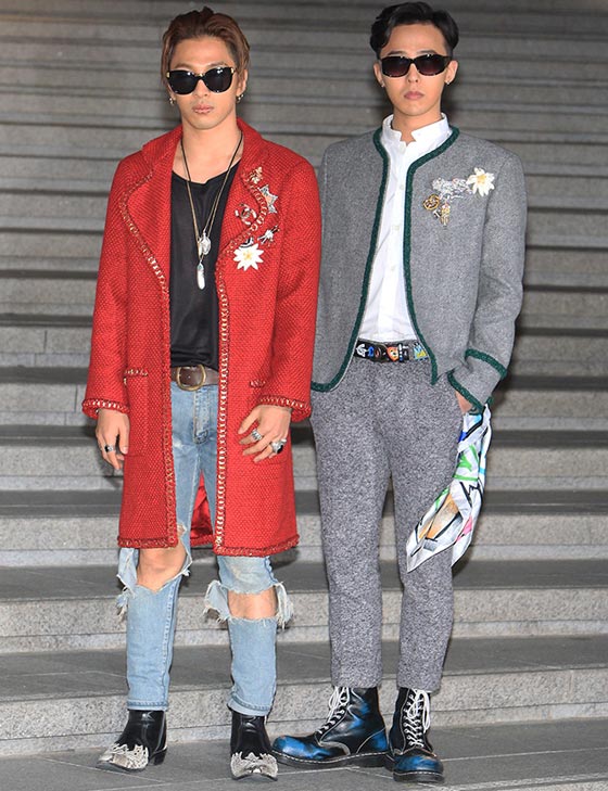 ج. دراغون اختار جاكيت من الصوف باللون الرمادي من مجموعة Paris-Salzburg 2014-2015 تزيّنت ببروشات ووشاح حريري. تايانغ ارتدى معطفا من التويد باللون الأحمر من مجموعة Paris-Salzburg 2014-2015.