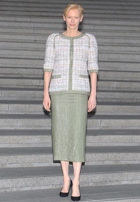 تيلدا سوينتون اختارت جاكيت من التويد نسّقتها مع تنورة متوسطة الطول باللون الأخضر الهادئ من مجموعة الخياطة الراقية لربيع وصيف 2015.
