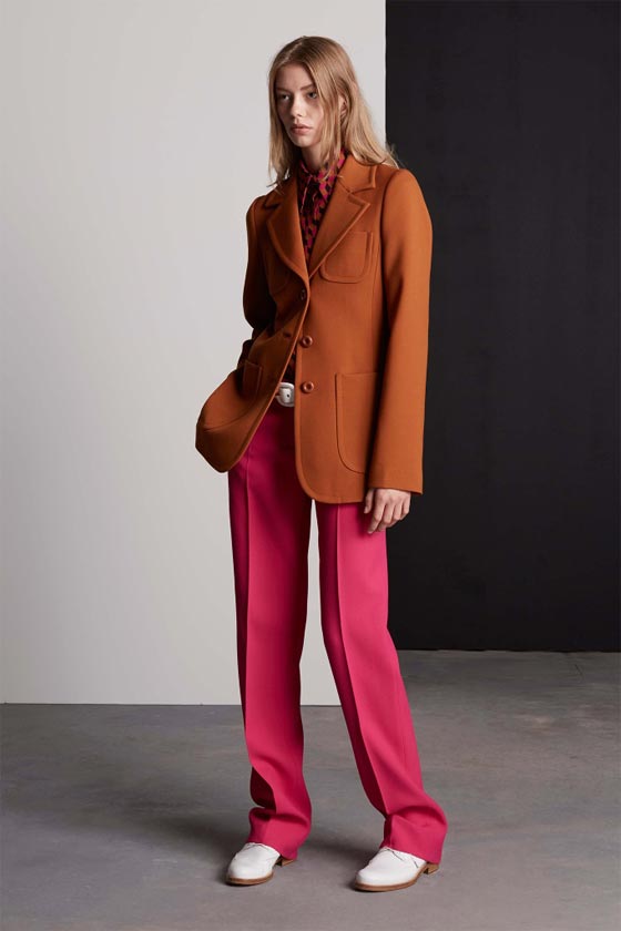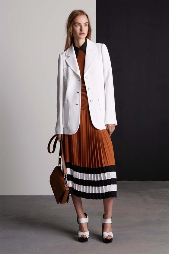 جاكيتات البلايزر من القطع التي تكرر ظهورها في هذه المجموعة، وقد تلوّنت بتدرجات حيادية يسهل تنسيقها مع العديد من الإطلالات. كما تكرّر ظهور التنانير المكسّرة بأطوال مختلفة.تضمّنت المجموعة أيضاً عدة تصاميم من المعاطف لفتتنا بأناقتها، وقد تزيّن العديد منها بياقات عريضة وأزرار كبيرة. كما لفتنا استعمال الجلد الذي أضاف لمسات راقية على الإطلالات. في القسم الثاني من العرض، ابتعد المصمم مايكل كورس عن تدرجات الكاراميل، واختار ألوان الحلوى كالوردي والبرتقالي التي نسّقها مع بعضها بعضا بأناقة لافتة.