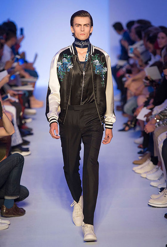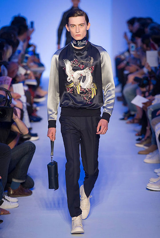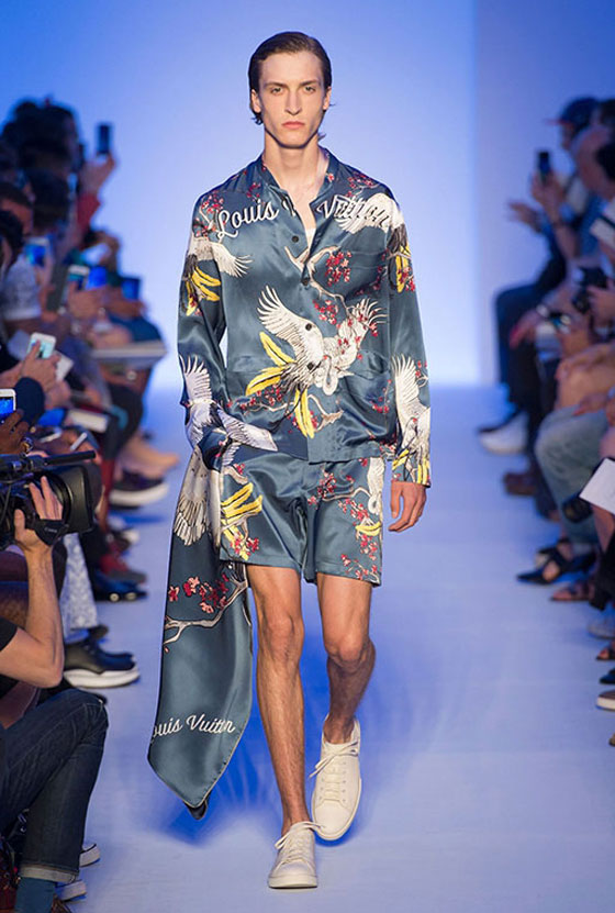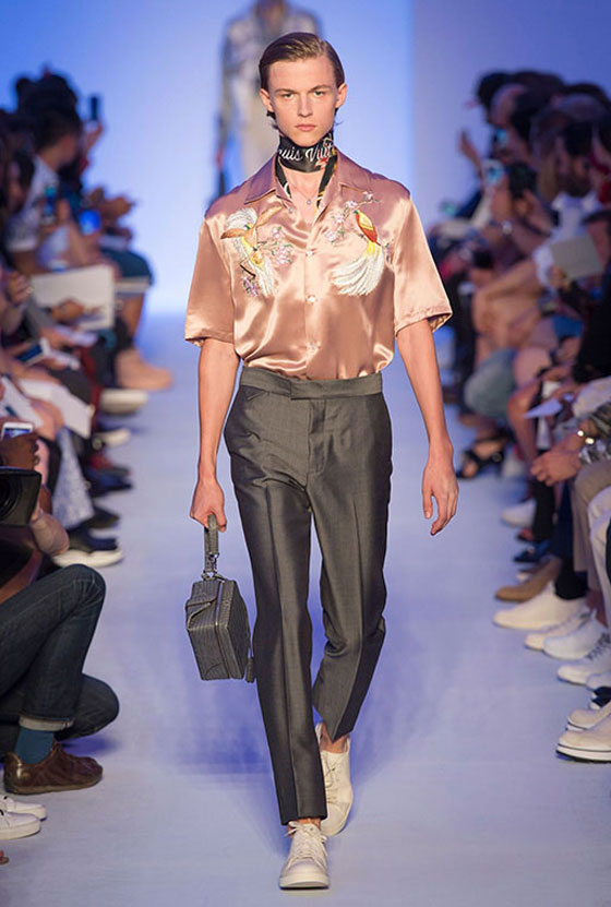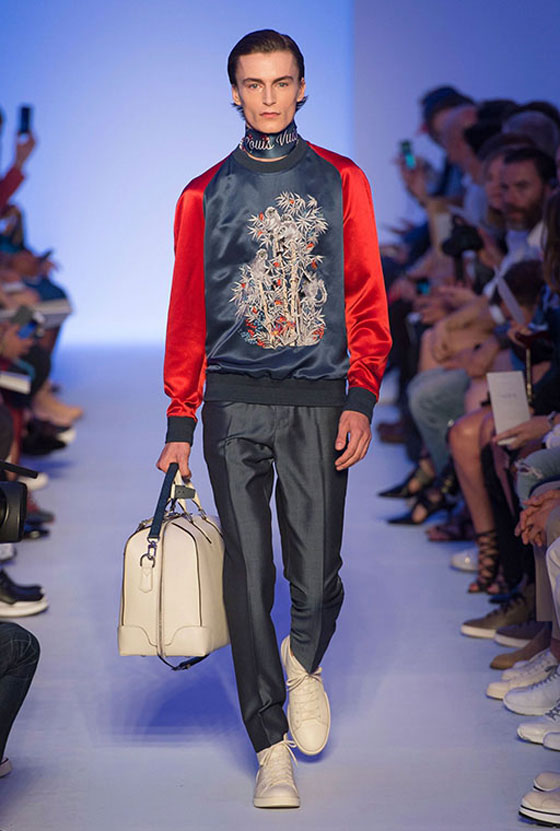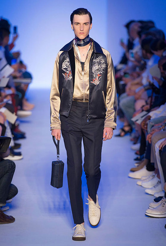 واستعملت الأقمشة الحريرية بكثافة في مجموعة Louis Vuitton الرجالية لربيع وصيف 2016. وقد اتخذت شكل قمصان وبنطلونات، أو جاكيتات ظهرت عليها تطريزات مستوحاة من حضارات الشرق الأقصى الغنيّة بالخرافات والأساطير. وكانت الألوان التي استعملت في هذه المجموعة محدودة جداً، حيث اقتصرت على الكحلي الذي اختلط بالأحمر حيناً وبالرمادي حيناً آخر، إضافة إلى البيج والأخضر الكاكي. ورافق الوشاح الشهير الذي يحمل توقيع Louis Vuitton معظم الإطلالات حيث توفر بصيغتين أنيقتين.