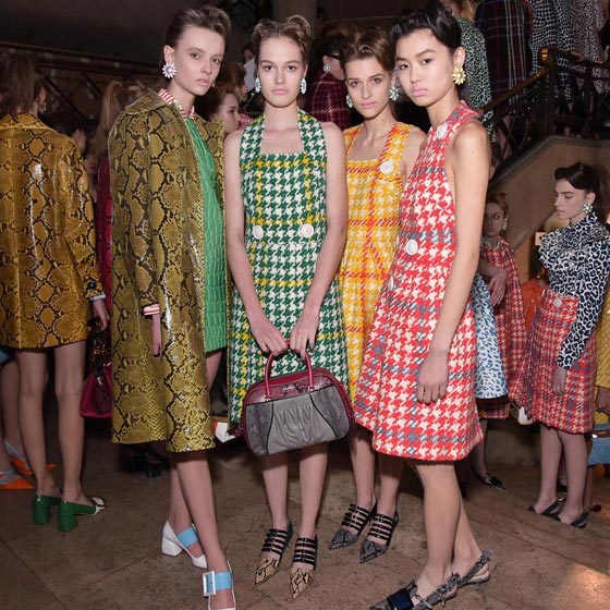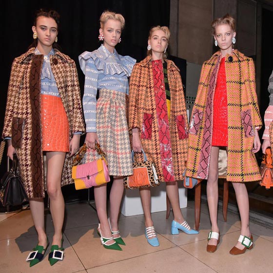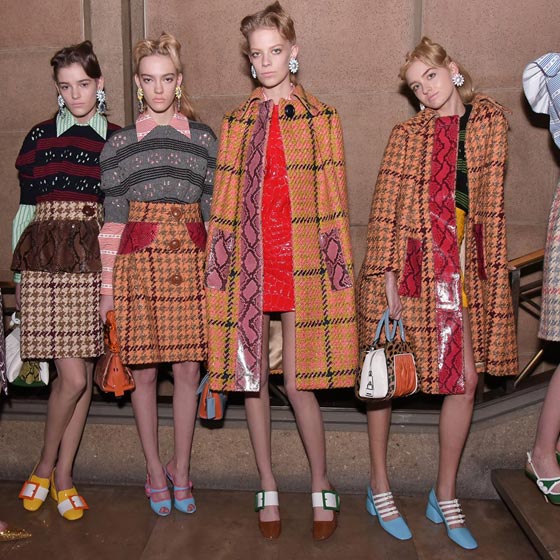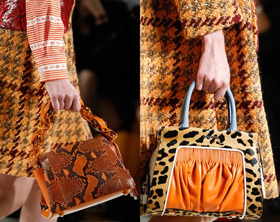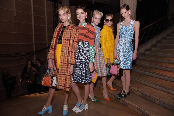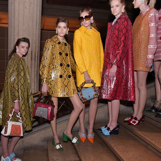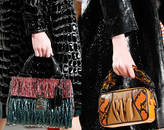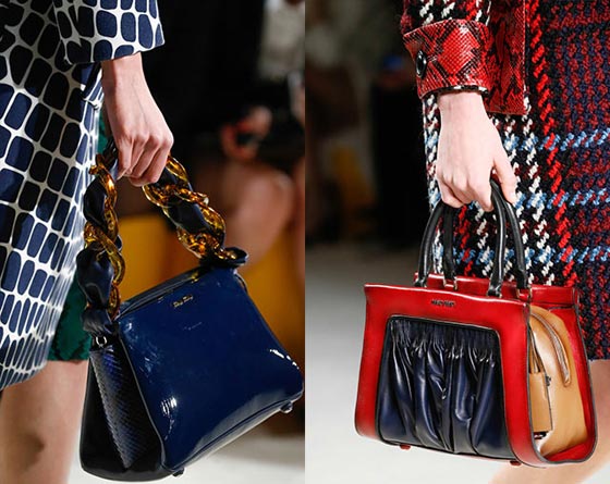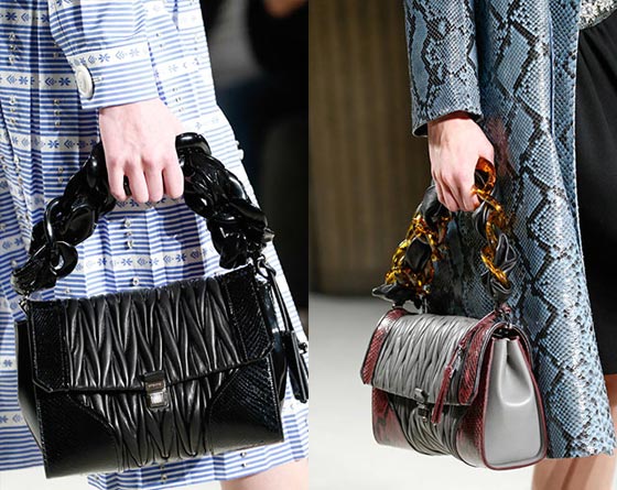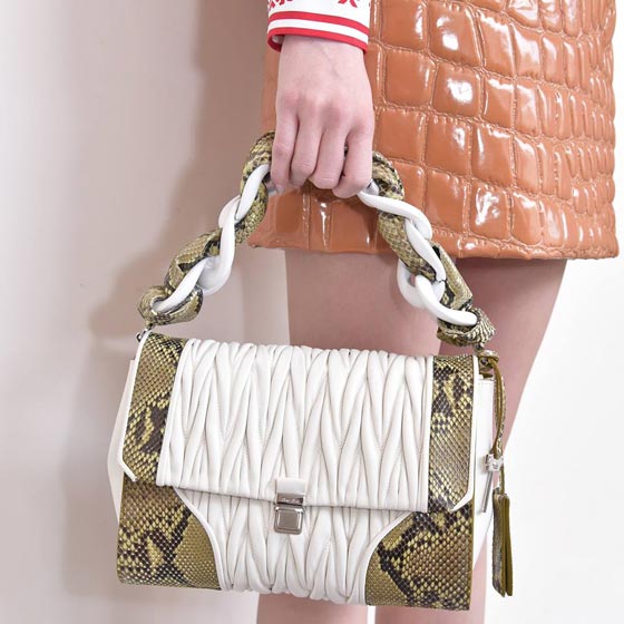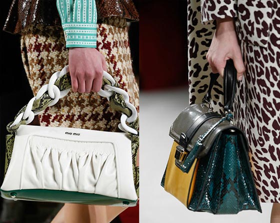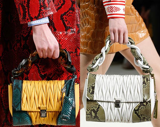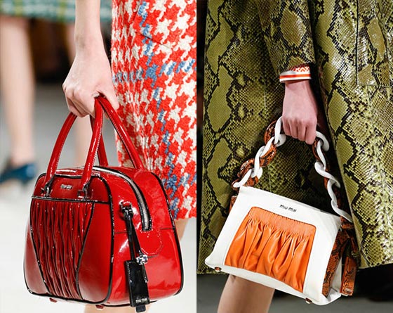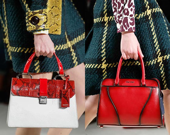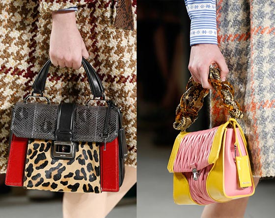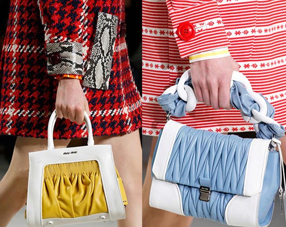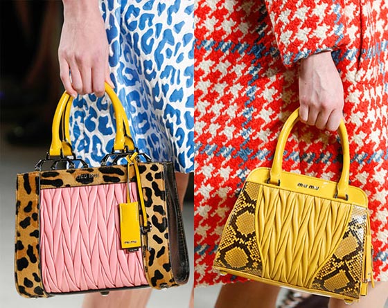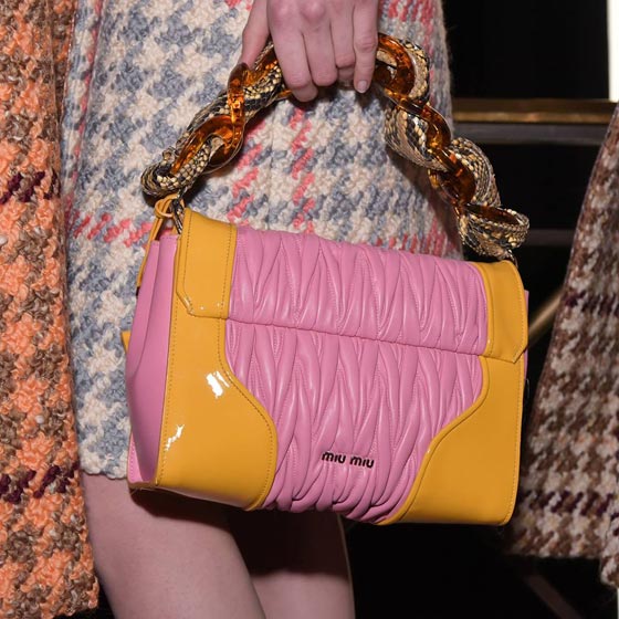 أستطاعت علامة ميو ميو أن تكسر المألوف من خلال مجموعتها الجديدة لخريف وشتاء 2015 – 2016، فأنتهجت موضة الألوان الصارخة والتي تعيد إلى أذهاننا صيحات السبعينات. فإلى جانب الأحمر، البني، والأسود قدمت تشكيلة رائعة من الحقائب الصفراء، البيضاء، وبرتقالية اللون، والتي وضعت فيها هذا العام خلاصة ابداعاتها، فجاءت التصاميم جريئة وبعيدة كل البعد عن التقليدية، وتستهدف بها بالطبع إمرأة مهووسة بكل ما هو فريد وأنيق. المجموعة بكاملها زودت بيد قصيرة، وزين بعضها بأقفال معدنية من الأمام أو بالعلامة الأيقونية للدار الإيطالية العريقة.