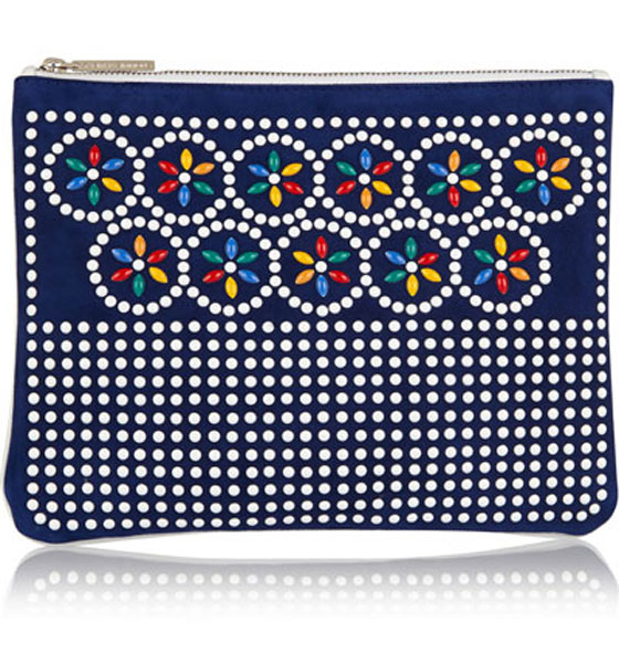 شنطة زرقاء منقطّة بالأبيض ومزخرفة بالألوان من Tabitha Simmons.