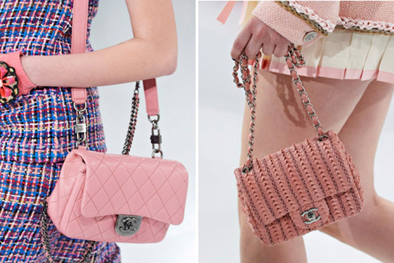 شنط شانيل كروز 2016 - على يمين الصورة شنطة قماش حيوية تجمع الوردي والفيروزي أما على اليسار نرى شنطة Flap جلدية بحجم صغير.