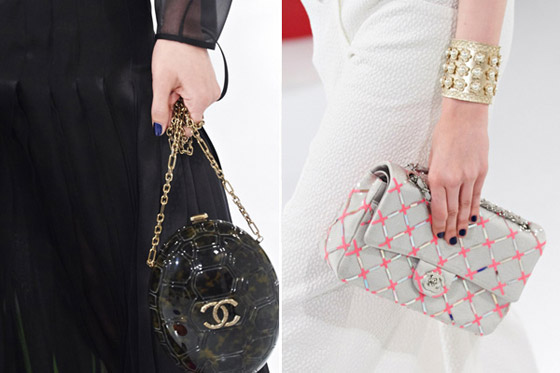 شنط شانيل كروز 2016 - على يمين الصورة نرى شنطة مونوكروم مبتكرة، وعلى اليسار شنطة أكثر إبتكاراً تجمع بين ستة ألوان بالأشرطة المتداخلة.