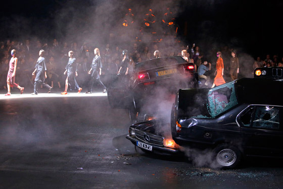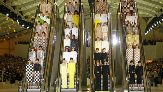 عارضات يقدمن أحدث مجموعة أزياء للمصمم الأمريكي مارك جاكوبس على سلم كهربائي، خلال عرض ربيع/صيف عام 2013، باريس، 3 أكتوبر/تشرين الأول 2012